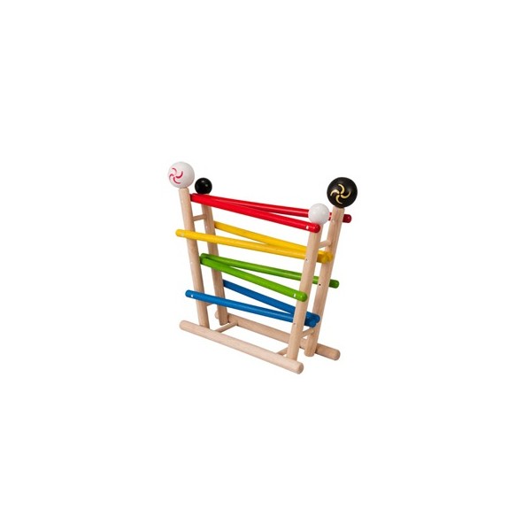รางไม้สีสันสดใส พร้อมลูกบอลที่มีลวดลาย ในชุดประกอบด้วย ลูกบอลกลวงที่มีกระดิ่งด้านใน 1 ลูก และลูกบอลตัน 1 ลูก รางไม้เป็นไม้ 2 ชิ้นมาขัดกันในแนวระนาบทำให้สินค้าชิ้นนี้มีความแตกต่างจากคู่แข่งเจ้าอื่น สามารถเก็บลูกบอลได้ง่ายโดยวางไว้บนไม้ด้านบน วิธีการเล่นคือวางลูกบอลที่รางไม้ด้านบนสุด และจ้องมองลูกบอลค่อยๆตกลงมาทีละขั้นๆ ลวดลายด้านข้างของลูกบอลจะช่วยพัฒนาทักษะด้านการมอง อีกทั้งเด็กๆยังสามารถเรียนรู้เรื่องกฎแห่งแรงดึงดูดเบื้องต้นได้